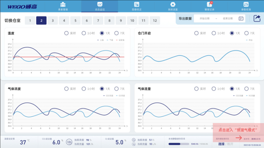 5.可選供氣模式:支持預(yù)混氣和三氣模式,可根據(jù)客戶使用需求設(shè)定,每倉(cāng)設(shè)獨(dú)立溫度和氣體濃度動(dòng)態(tài)曲線圖,可按小時(shí)、天、7天等時(shí)段進(jìn)行設(shè)置,便于隨時(shí)觀察。氣體濃度控制精確、偏差小,倉(cāng)室均配置獨(dú)立氣泵并獨(dú)立操控,保證倉(cāng)室內(nèi)氣體濃度符合培養(yǎng)要求。